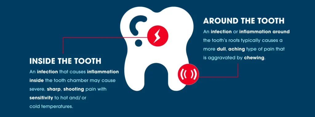 The origin of dental pain can influence how it feels. For example, an infection that causes inflammation inside the tooth chamber may cause severe, sharp shooting pain, while an infection or inflammation around the tooth’s roots typically causes a more dull aching type of pain. Sensitivity to hot and/or cold temperatures typically accompanies pain originating inside the tooth, while pain with its source in the structures around the tooth is aggravated by chewing.