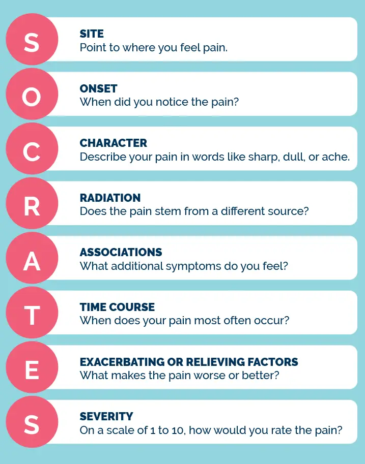 • Severity – How would you rate the pain on a scale of 1 to 10, where 1 is barely noticing some discomfort and 10 is an emergency room visit?