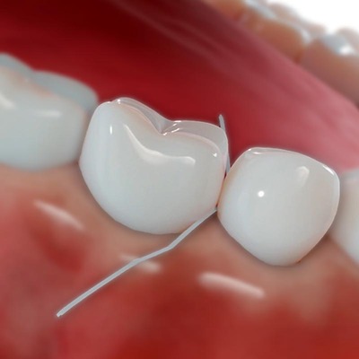 • Step 3 – Gently glide the floss between your teeth. Using too much pressure can be damaging to your gums.